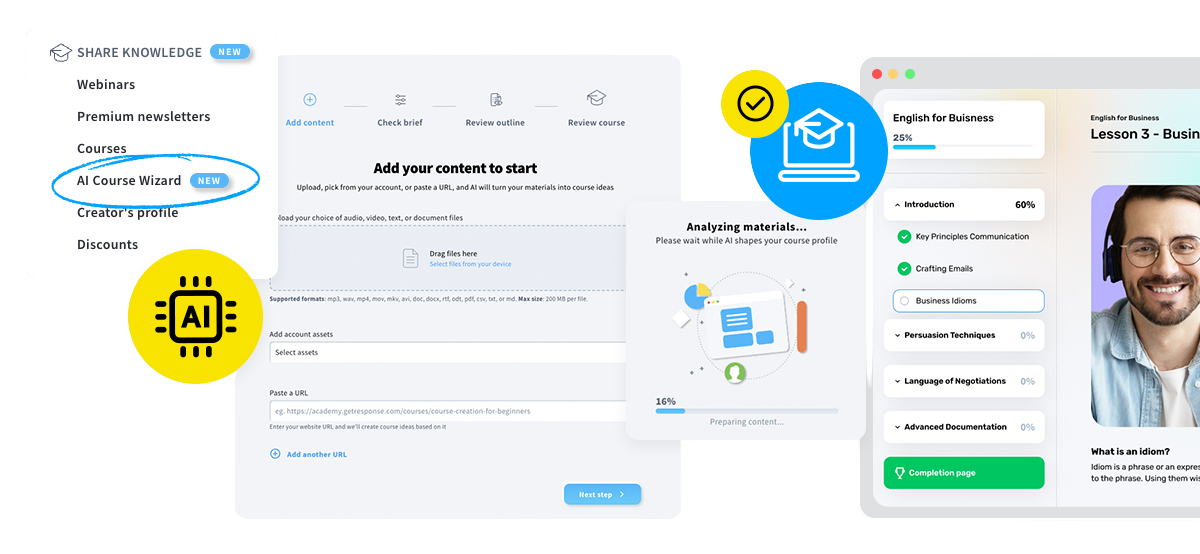 With Course Wizard, AI transforms your existing content into ready-to-publish courses in about 30 minutes: helping you grow your list, build authority, and get more from every asset you create.
